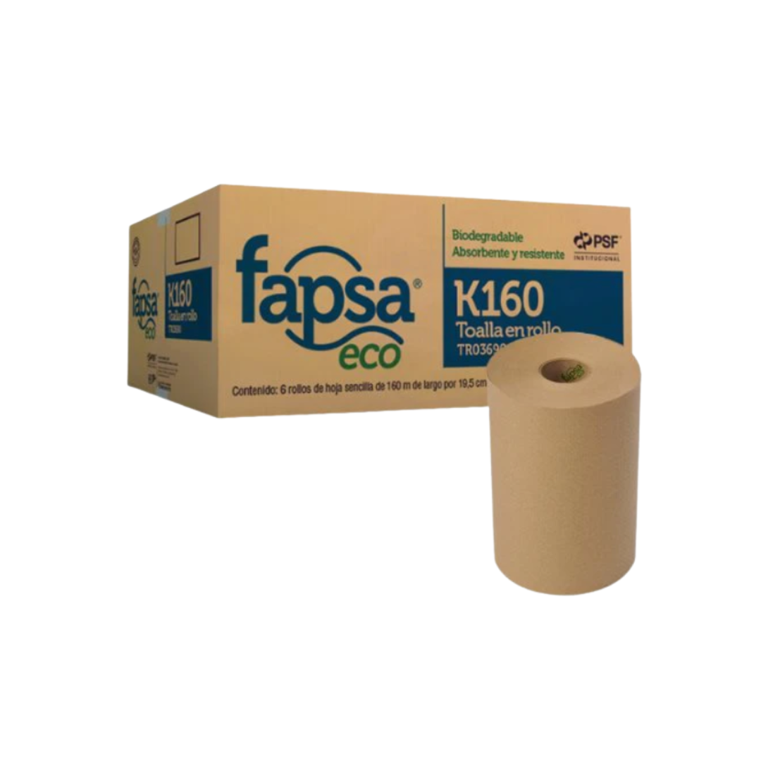 Las toallas en rollo Fapsa Eco K160 (TR03690) de tono kraft natural combinan eficiencia y conciencia ecológica. Cada rollo de 160 m de hoja sencilla con grabado ofrece gran absorbencia y resistencia. Vienen en caja con 6 rollos (960 m totales), con metraje certificado, diseñadas para entornos institucionales que buscan un producto eco-amigable y duradero.