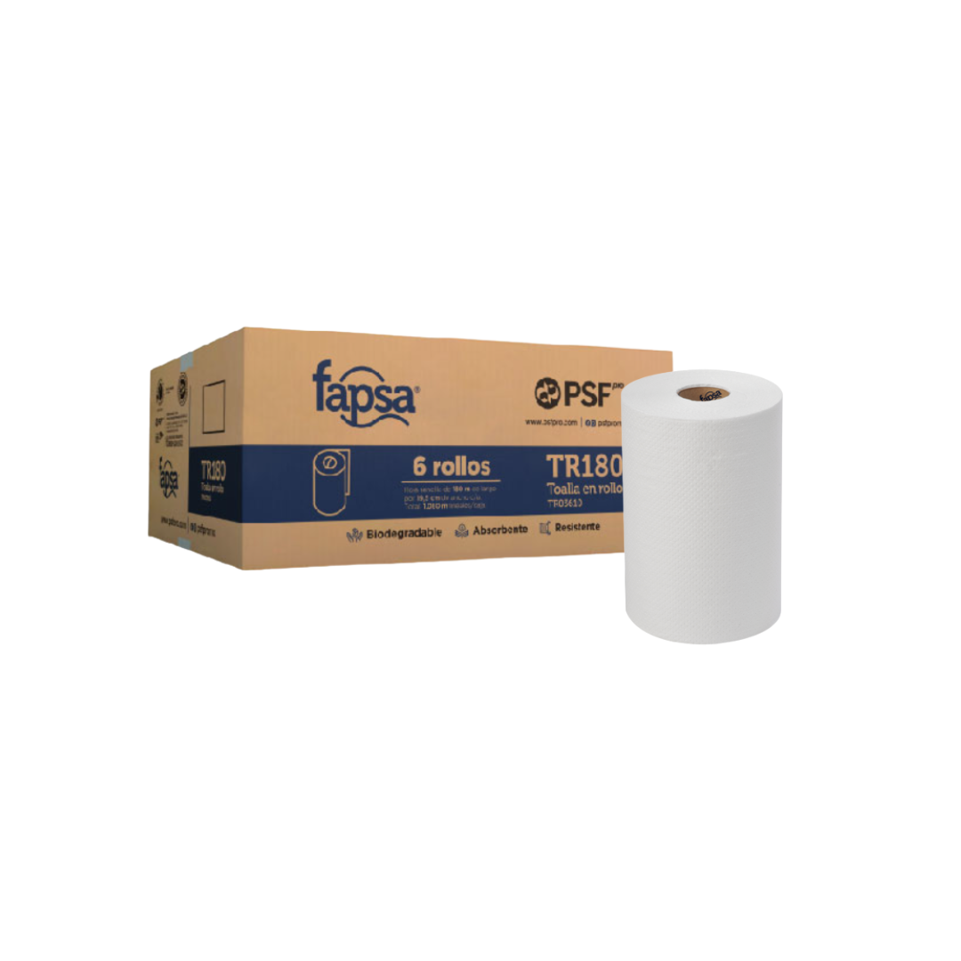 Las toallas en rollo Fapsa TR03610 ofrecen máxima absorbencia y suavidad. Cada rollo tiene 180 m de hoja sencilla grabada en papel blanco, elaborado con fibras 100 % recicladas, muy absorbente y resistente. Viene en caja con 6 rollos (total 1 080 m), cuenta con metraje certificado y es ideal para oficinas, escuelas, restaurantes, hospitales y otros entornos institucionales.”