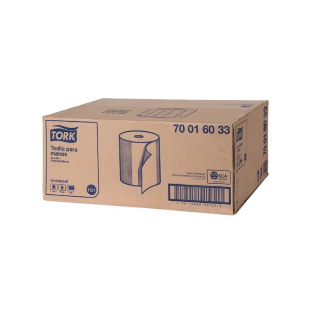 Las toallas en rollo Tork Universal (clave 700160) ofrecen 180 m por rollo y vienen en presentaciones de 6 piezas por caja. Fabricadas con fibras 100 % recicladas, estas toallas ecológicas y versátiles son compatibles con cualquier dispensador estándar del mercado, ideales para oficinas, escuelas y entornos institucionales con flujo medio.